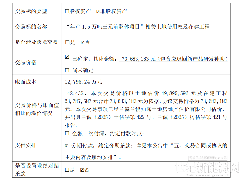 根据协议,兰溪开发区管委会将有偿收回公司位于光膜小镇创新大道北侧、经三路东侧的土地及房屋(含建筑(构)物、附属设施),即“年产1.5万吨三元前驱体项目”所涉土地使用权及在建工程。交易总金额为7368.32万元,其中包含需退回的“新产品研发补助”2000万元,抵扣后实际成交金额为5368.32万元。