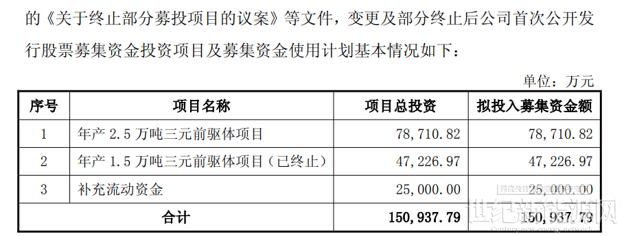 回顾项目历程,2022年11月~12月,公司董事会、监事会及股东大会先后审议通过变更部分募投项目实施主体、地点及方式的议案,将原“年产4万吨三元前驱体项目”拆分为“年产2.5万吨”与“年产1.5万吨”两个项目分别实施。