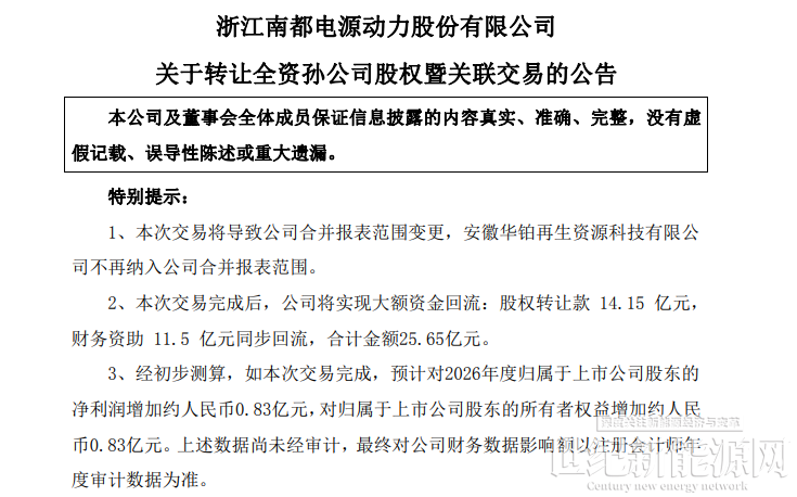 3月13日,公司发布公告,拟将全资孙公司安徽华铂再生资源科技有限公司100%股权以14.15亿元的价格转让给安徽省厚基联能运营管理合伙企业。交易完成后,南都电源将同步收回股权转让款14.15亿元及财务资助11.5亿元,合计回流资金25.65亿元。经初步测算,这笔交易预计将为2026年归母净利润增加约0.83亿元。