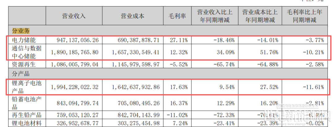 当前,储能业务正成为公司营收的重要来源。2025年半年报显示,公司电力储能营收9.47亿元,通信与数据中心储能营收18.9亿元,两项合计营收占比超过72%。锂离子电池产品更是以19.94亿元的营收成为第一大收入来源。