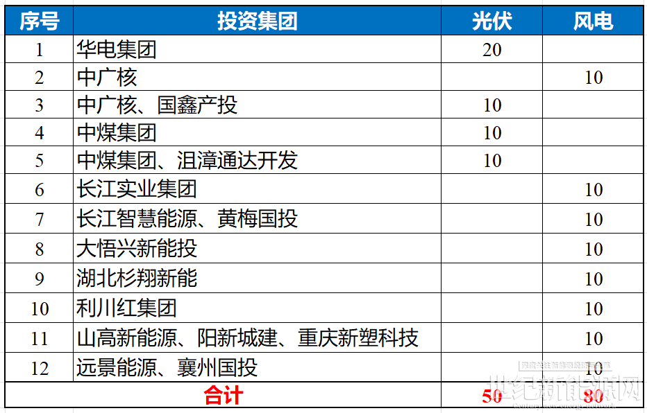 表:湖北加强风光发电资源利用试点项目投资企业情况(单位:万千瓦)