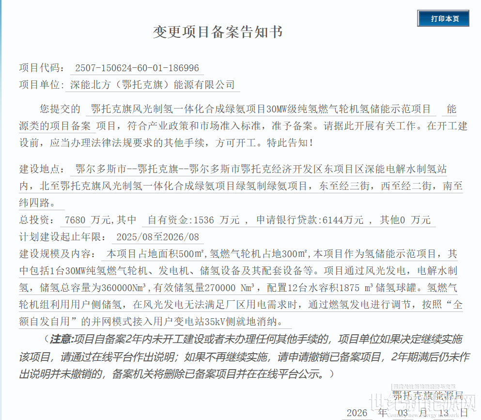 近日,内蒙古自治区投资项目在线审批办事大厅发布,鄂托克旗风光制氢一体化合成绿氨项目30MW级纯氢燃气轮机氢储能示范项目发布变更通知。