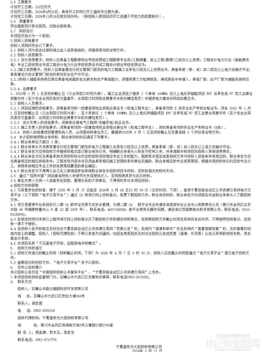3月17日,石嘴山国家高新区独立新型储能项目EPC总承包招标公告发布。