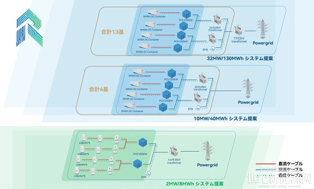 针对日本电网典型的 6.6kV / 22kV / 77kV 电压等级结构,远信储能构建了标准化储能系统平台,并在展会上展示三类应用场景解决方案:32MW / 130MWh 电网级储能系统;10MW / 40MWh 区域级储能系统;2MW / 8MWh 储能系统。