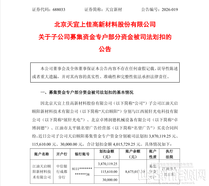 3月20日,天宜新材(SH:688033)发布公告,公司子公司江油天启颐阳新材料技术有限公司分别与江西展轩光电科技有限公司、北京卓博润德机械设备有限公司、江油市太平镇名望广告经营部买卖合同纠纷,近日公司子公司天启颐阳募集资金专户资金分别被司法划扣3,870,119.25元、115,610.00元、30,000.00元,合计划扣金额4,015,729.25元。