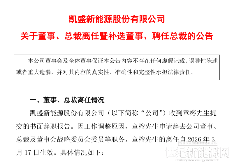 2026年3月17日,凯盛新能源股份有限公司(以下简称“凯盛新能”)发布公告称,章榕先生因工作调整,已提交书面辞职报告,申请辞去公司董事、总裁及董事会战略委员会委员等职务。离任后,章榕先生将不在公司及其控股子公司担任任何职务。