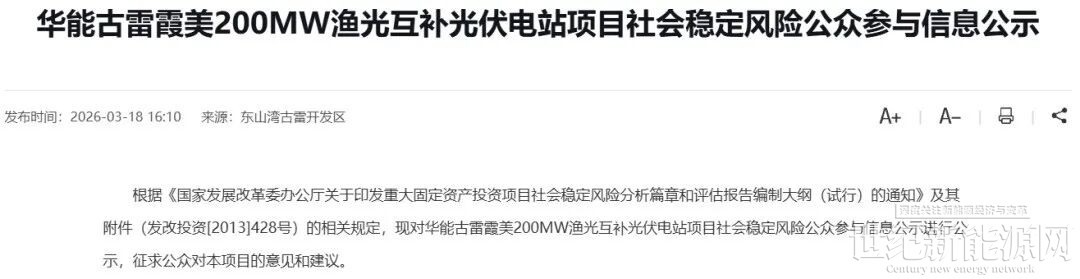 3 月 18 日,福建省漳州市东山湾古雷开发区政府官网发布“华能古雷霞美 200MW 渔光互补光伏电站项目社会稳定风险公众参与信息公示”。