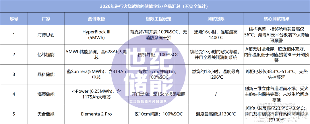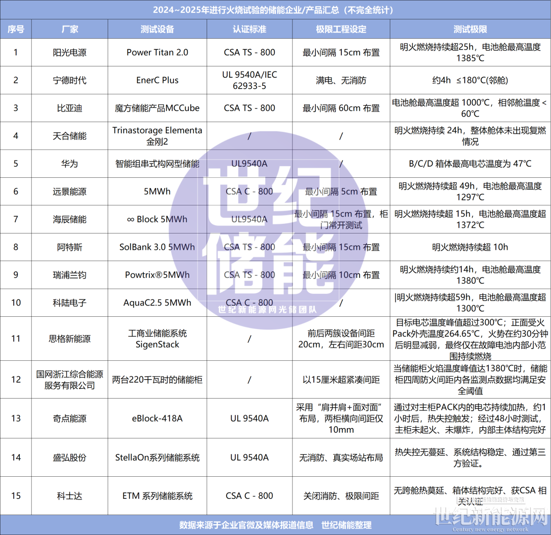 如果说2024年阳光电源率先“燃烧自家电站”是行业安全验证的开创之举,那么到了2026年,大规模防火测试已成为头部储能厂商的“标配动作”。宁德时代、比亚迪储能、华为数字能源、瑞浦兰钧、远景储能、阿特斯储能等近20家头部企业已卷入这场安全验证的“军备竞赛”。