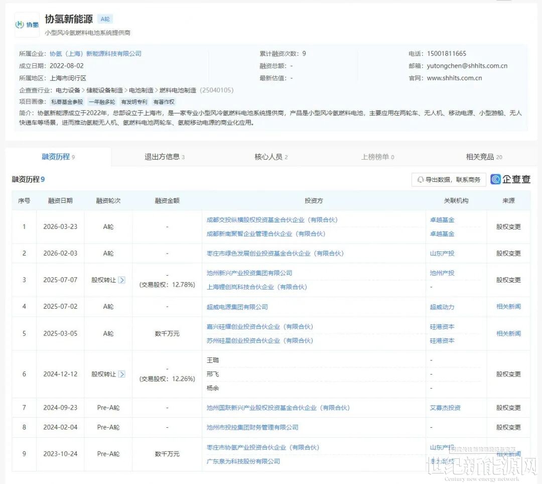 氢能观察从企查查获悉,近日,协氢新能源完成A轮融资,融资额未公布,本轮投资方为卓越基金,完成本次融资后,协氢新能源发生股权变更。