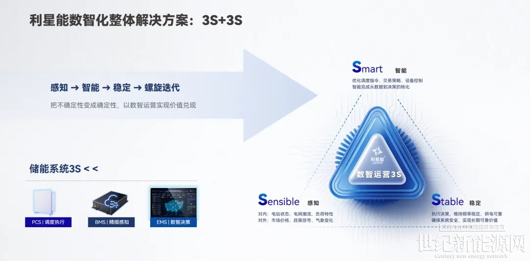 随着电力市场化改革深入推进,新型储能的独立市场主体地位逐步凸显,价值维度不断丰富,运营策略成为放大储能资产全生命周期价值的重要因素。为使得长周期中的不确定性转化为可预测、可验证、可融资的确定性价值,利星能构建综合能源智慧管理体系,并提出3S+3S数智化整体解决方案。