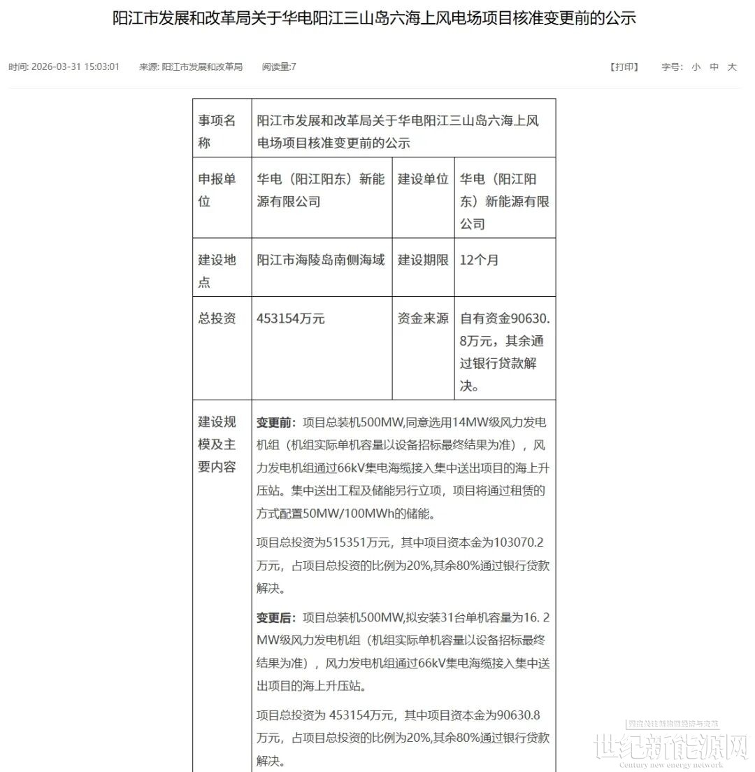 3月31日,阳江市发展和改革局对华电阳江三山岛六海上风电场项目核准变更事项进行公示,项目拟将原核准的14MW级风电机组方案调整为31台单机容量16.2MW级风电机组,总装机容量仍为500MW。总投资拟由515,351万元调整为453,154万元。