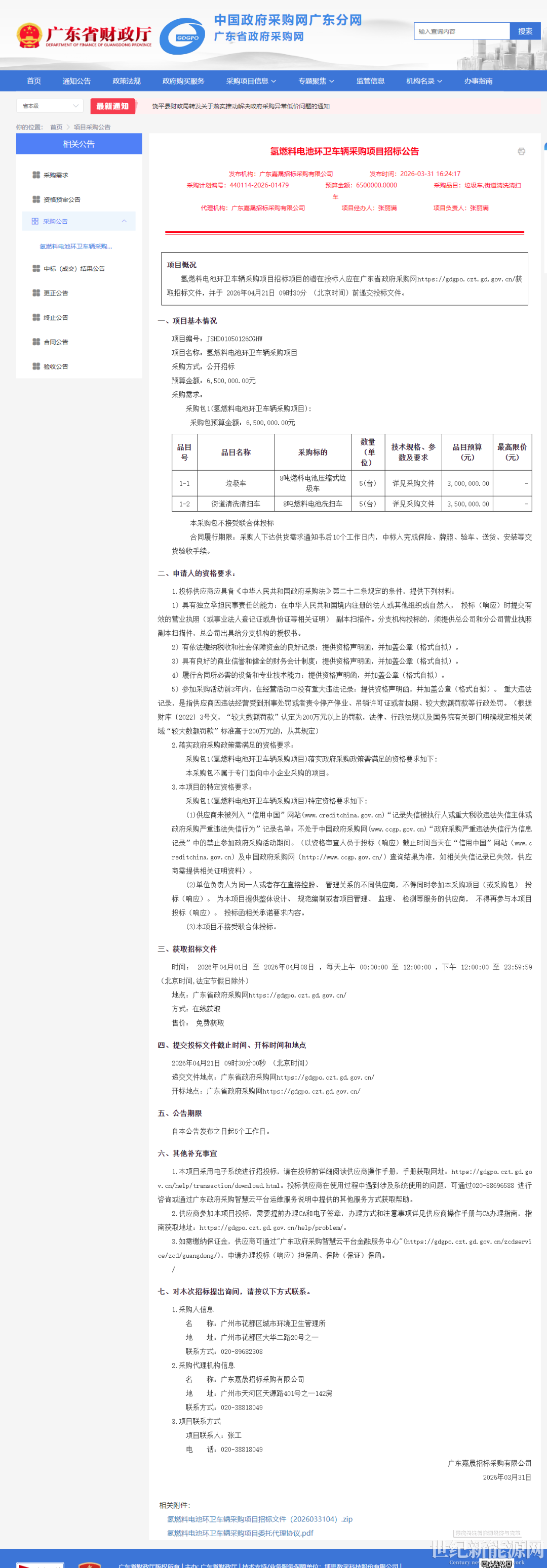 氢能观察从广东省政府采购网获悉,广州市花都区城市环境卫生管理所采购5台8吨燃料电池压缩式垃圾车(预算300万元)和5台8吨燃料电池洗扫车(预算350万元),共10台氢燃料电池环卫车,采购预算共650万元。