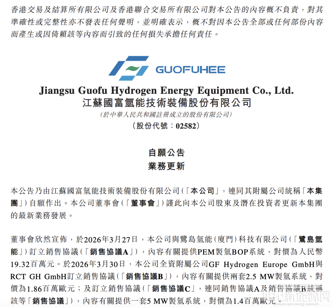 值得一提的是,国富氢能同日发布公告称,于2026年3月27日,本公司与鹭岛氢能(厦门)科技有限公司(简称“鹭岛氢能”)订立销售协议(下称“销售协议A”),内容有关提供PEM制氢BOP系统,对价为人民币1932万元。于2026年3月30日,本公司全资附属公司GF Hydrogen Europe GmbH与 RCTGH GmbH订立销售协议(下称“销售协议B”),内容有关提供两套2.5MW制氢系统,对价为186万欧元;及订立销售协议(下称“销售协议C”,连同销售协议A及销售协议B统称“该等销售协议”),内容有关提供一套5MW制氢系统,对价为140万欧元。