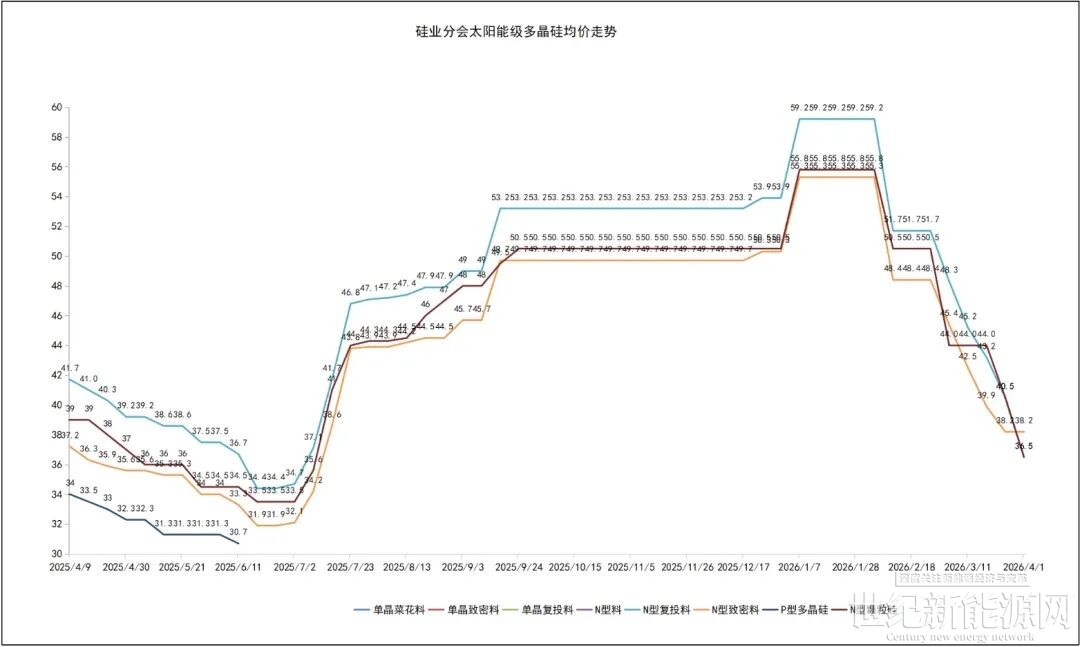 据硅业分会最新数据,本周部分多晶硅价格继续下跌。