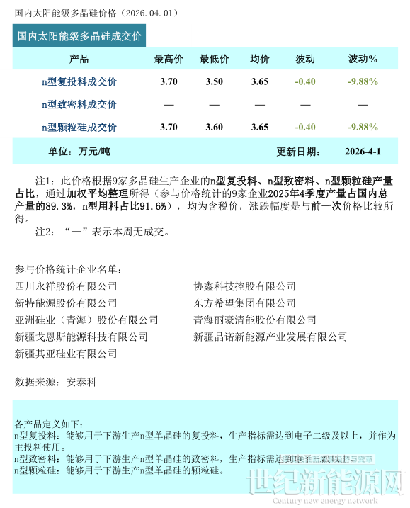 本周多晶硅n型复投料成交价格区间为成交均价为3.65万元/吨,环比下滑9.88%;n型颗粒硅成交均价为3.65万元/吨,环比下滑9.88%。