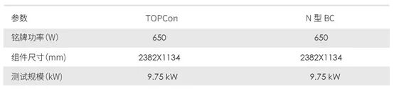 测试样本:TOPCon组件(额定功率650W)15块,同功率BC竞品组件(额定功率650W)15块,两类型组件总容量均为9.75kW。