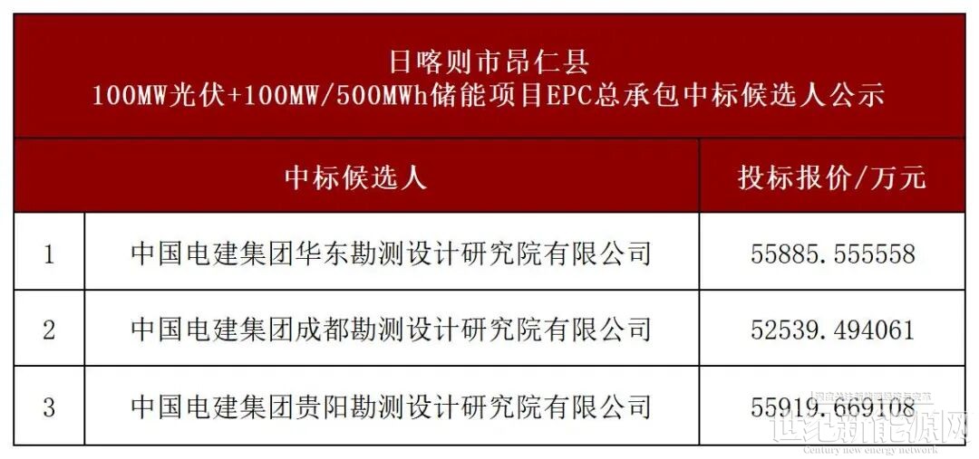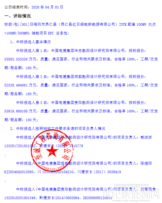 3月31日,日喀则市昂仁县(昂仁县红日绿能新能源有限公司)朱诺铜矿配套100MW光伏+100MW/500MWh储能项目EPC总承包中标候选人公示。中国电建集团华东院、成都院、贵阳院3家依次入围,拟5.59亿锁定大型光储项目订单。