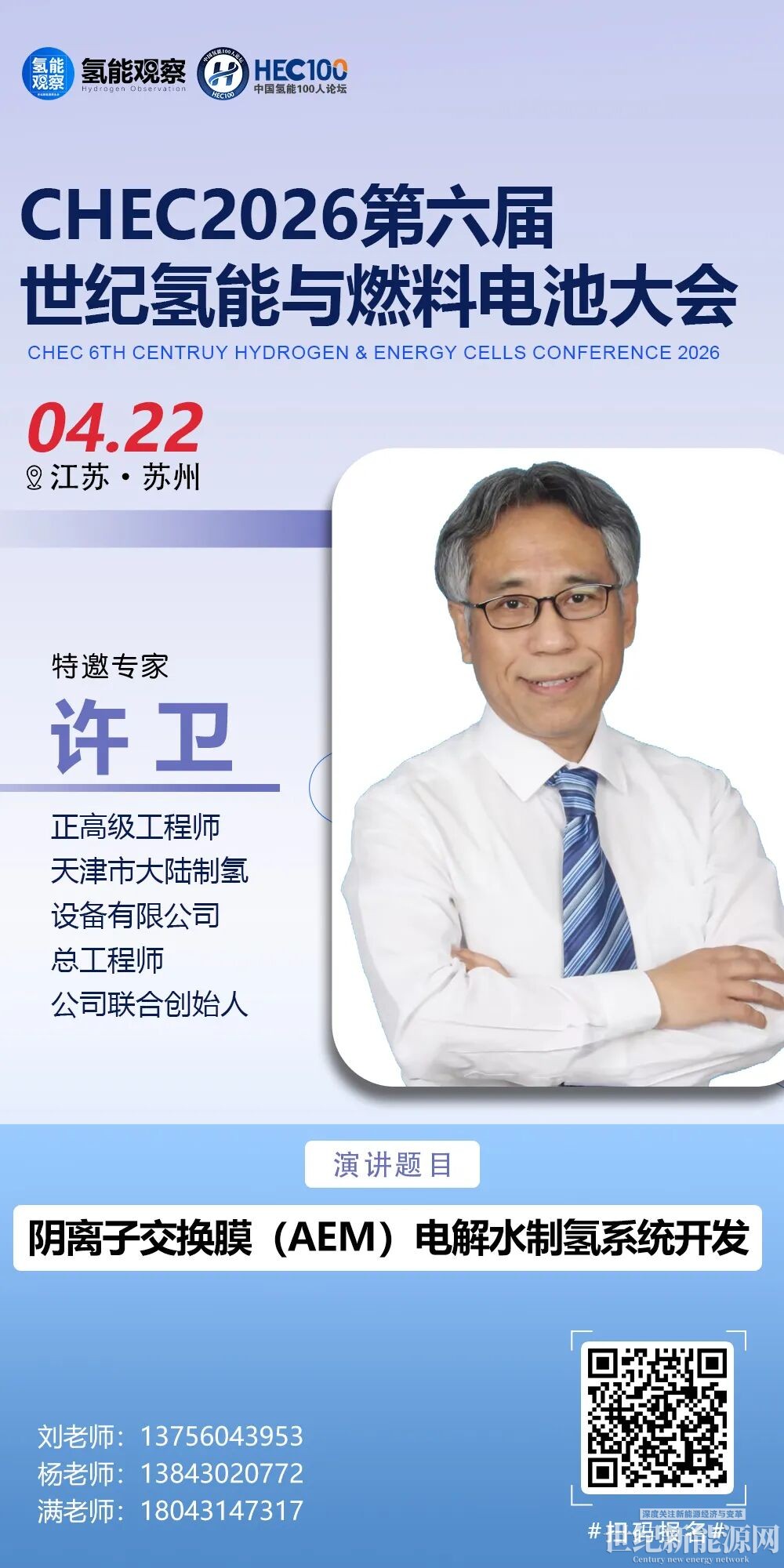 许卫,天津市大陆制氢设备有限公司总工程师,公司联合创始人,全国氢能标准化技术委员会(SAC/TC309)委员、全国气体分离与液化设备标准化技术委员会(SAC/TC504)委员、中国可再生能源学会氢能专业委员会委员、ISO/TC197注册专家。