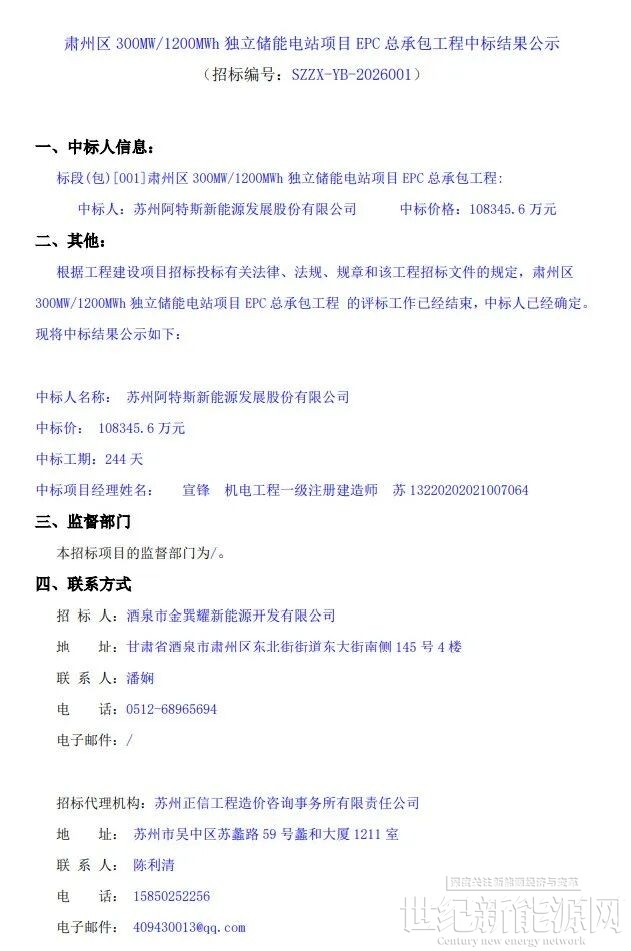 4月3日,肃州区300MW/1200MWh独立储能电站项目EPC总承包工程中标结果公示。