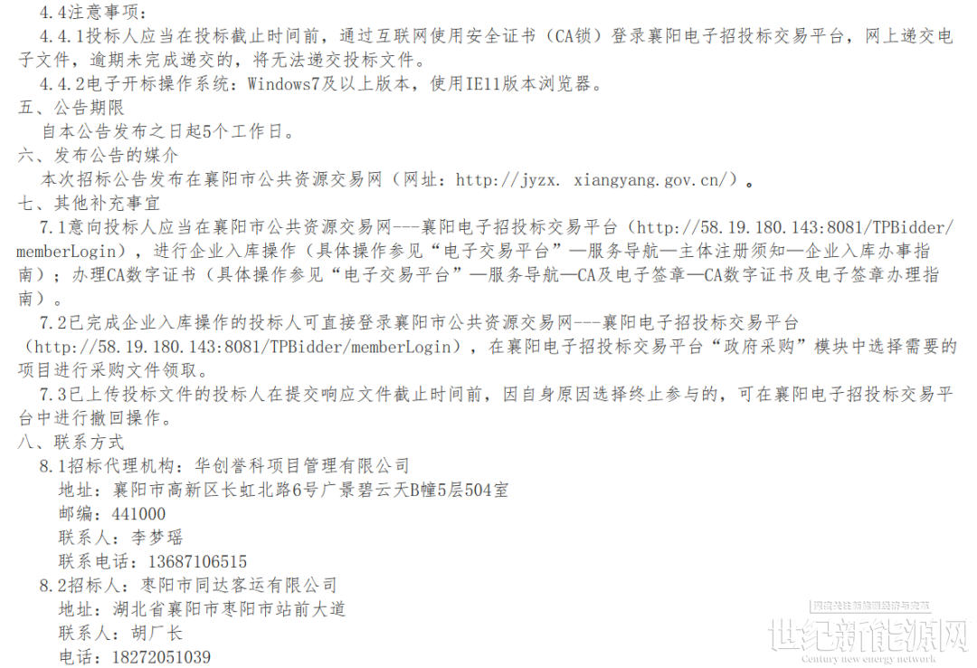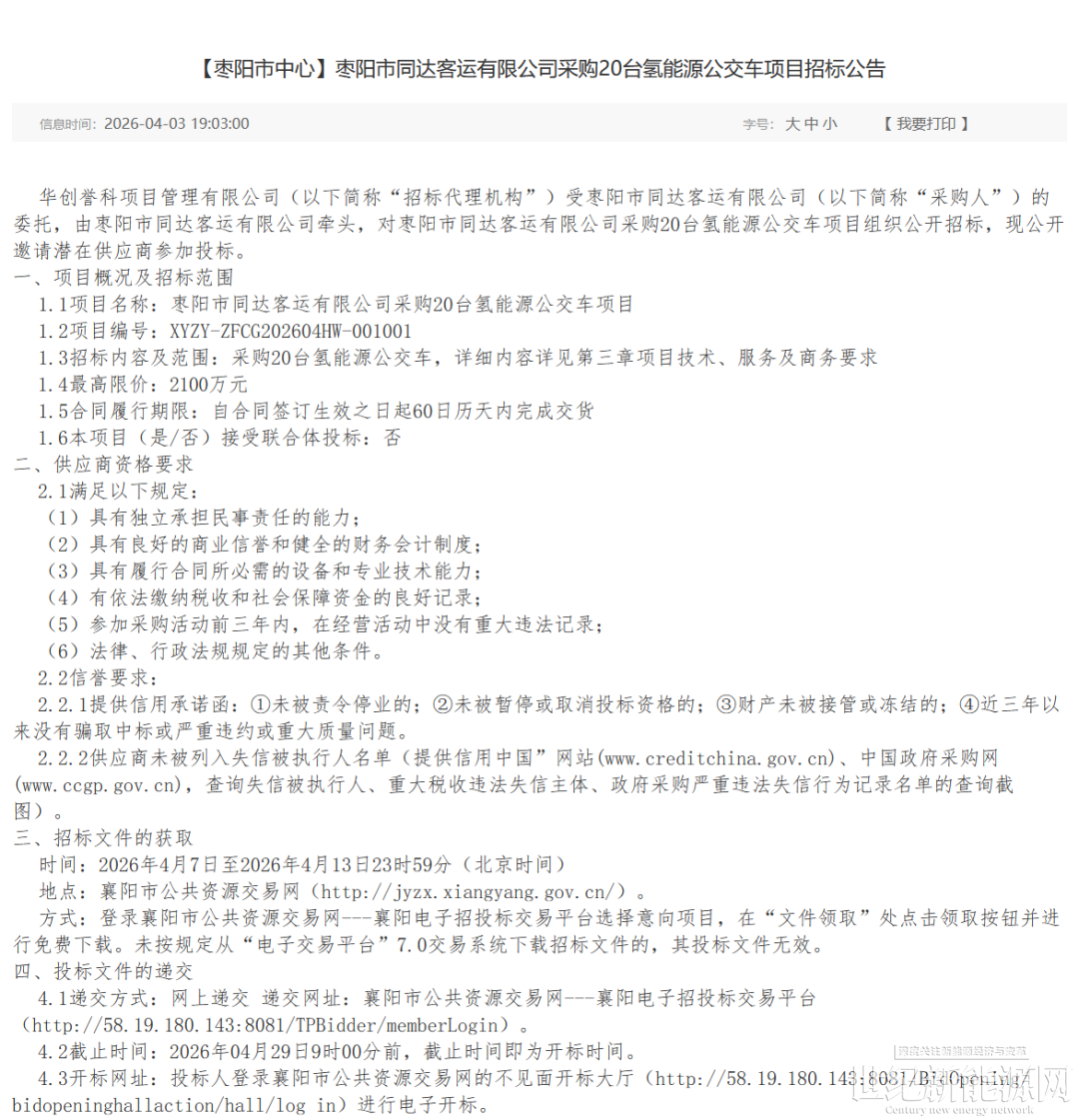 4月3日,襄阳市公共资源交易网发布枣阳市同达客运有限公司采购20台氢能源公交车项目招标公告。