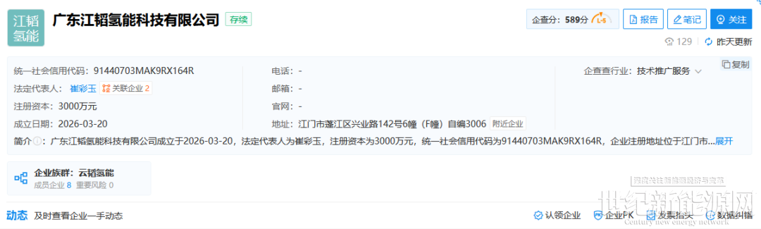 3月20日,广东江韬氢能科技有限公司,注册资本3000万元,法定代表人崔彩玉。