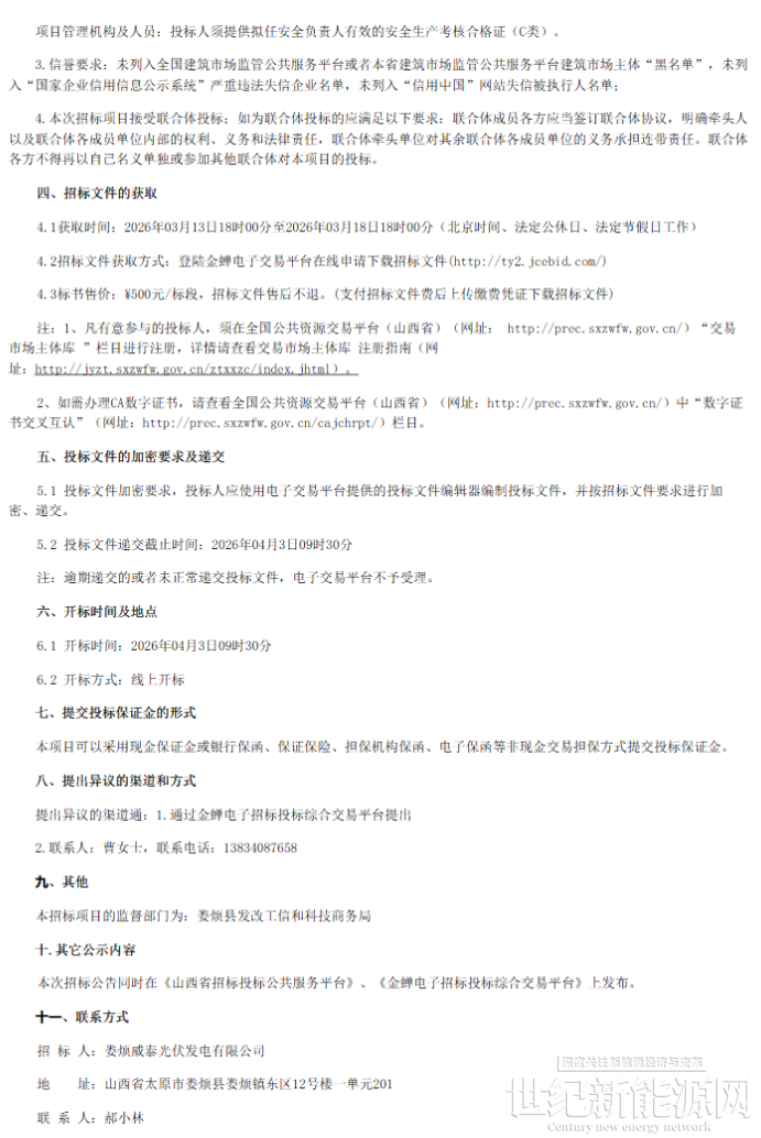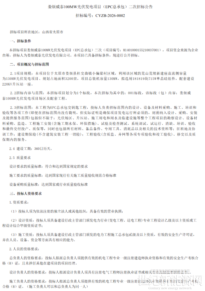 近日,山西【娄烦威泰100MW光伏发电项目(EPC总承包)二次招标】公示中标候选人。