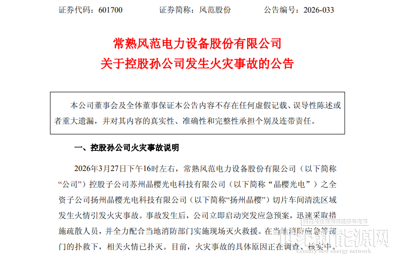 此前的3月末,风范股份发布常熟风范电力设备股份有限公司关于控股孙公司发生火灾事故的公告。