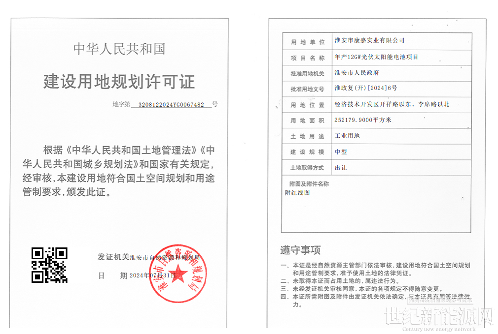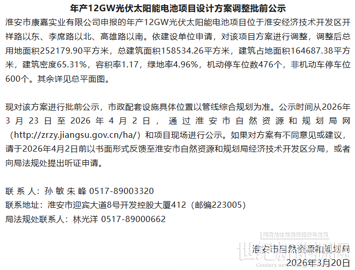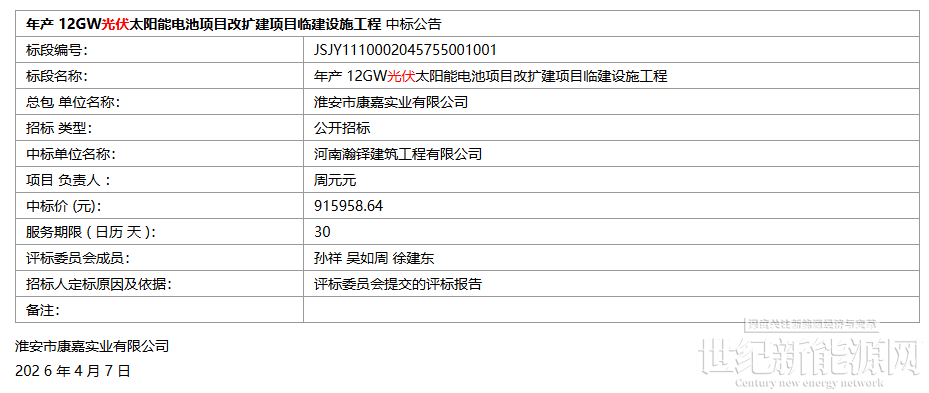 4月7日,淮安市康嘉实业有限公司发布《年产12GW光伏太阳能电池项目改扩建项目临建设施工程中标公告》。