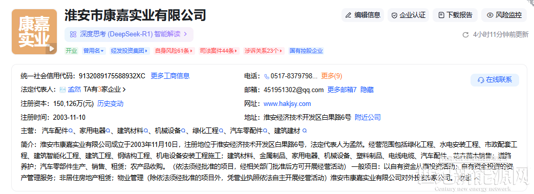 公开资料显示,淮安市康嘉实业有限公司成立于2003年,由淮安经济技术开发区经济发展集团有限公司控股,为国有控股企业。
