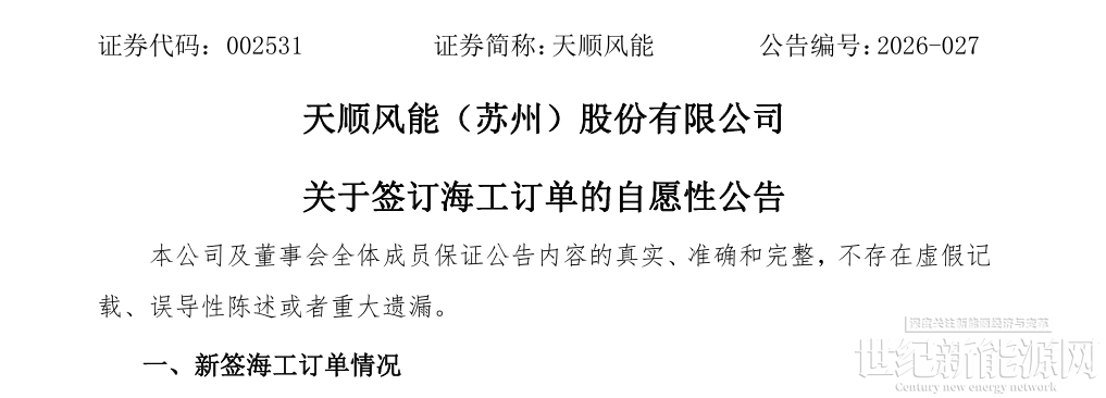 4月7日,天顺风能(苏州)股份有限公司(以下简称“天顺风能”或“公司”)发布《关于签订海工订单的自愿性公告》。