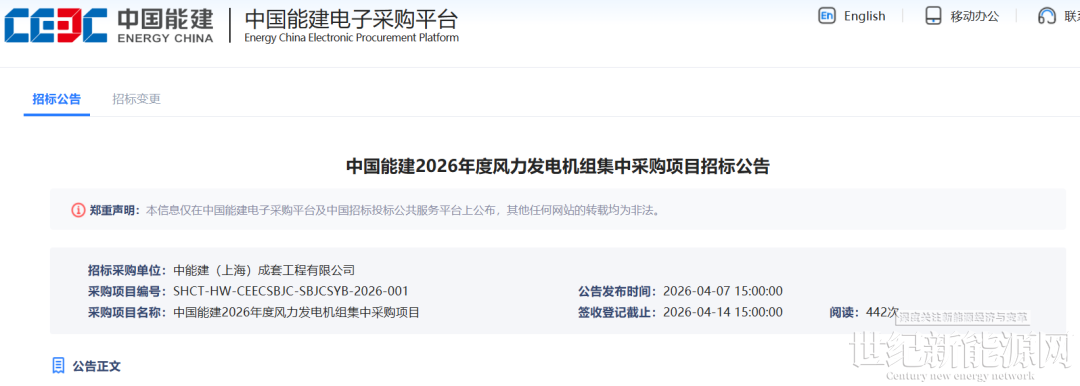 中国能建2026年度风力发电机组集中采购项目招标公告