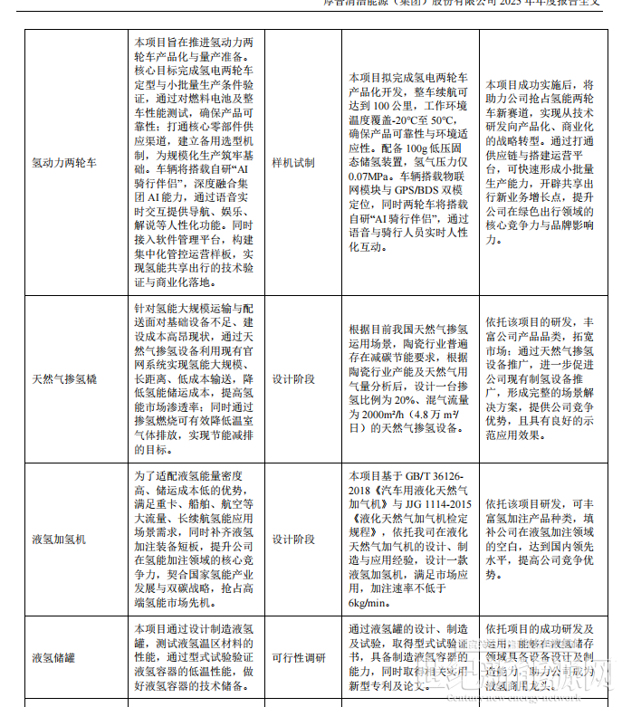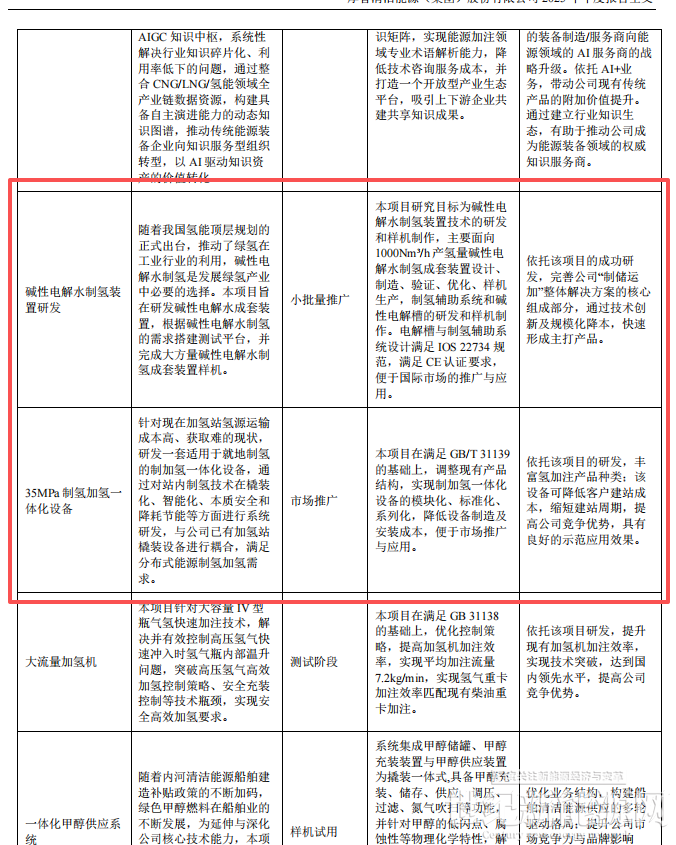 报告期内,公司为氢动力飞机提供 70MPa 超高压一体式加氢设备并成功应用,并联合合作伙伴成功交付西南地区首套 220kW 高安全固态储氢燃料电池应急发电系统,以及新签西班牙 Gas Eco 项目、新疆 5MW 分布式光伏制储加氢一体化(试验示范) 项目标段四制储加氢一体化(试验示范) 项目 EPC总承包项目、出口欧洲 1000Nm³/h 碱性电解水成套设备等。