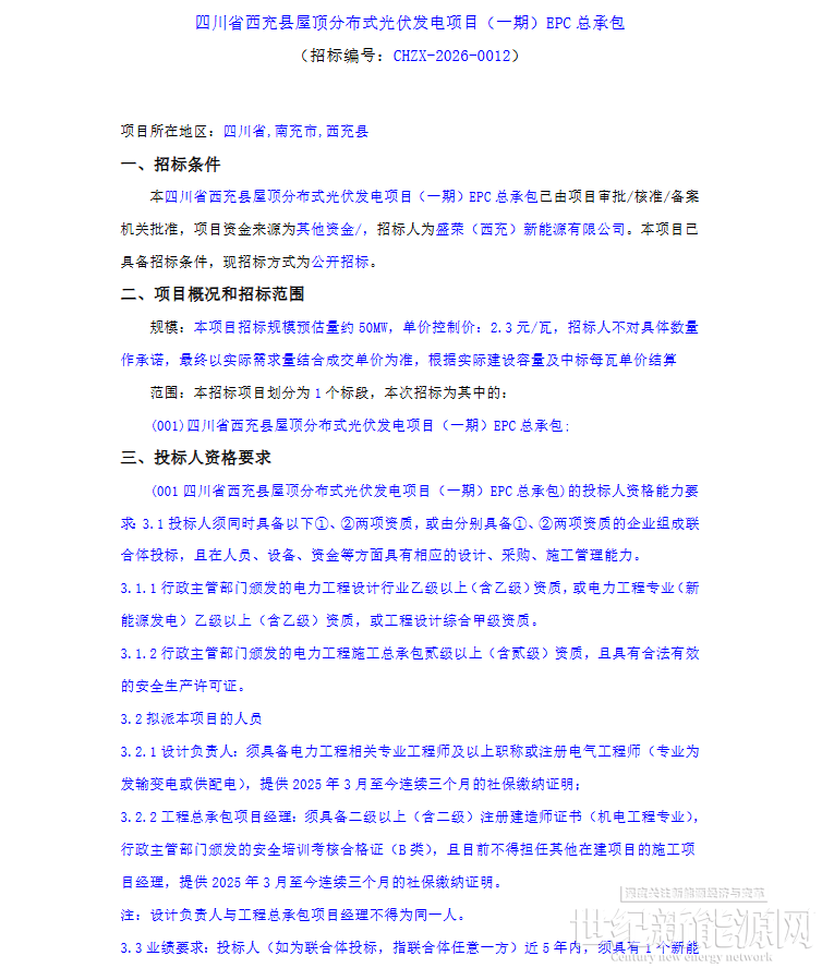 4月7日,【四川省西充县屋顶分布式光伏发电项目(一期)EPC总承包】招标公告发布,招标人为盛荣(西充)新能源有限公司,项目所在地区为四川省南充市西充县。