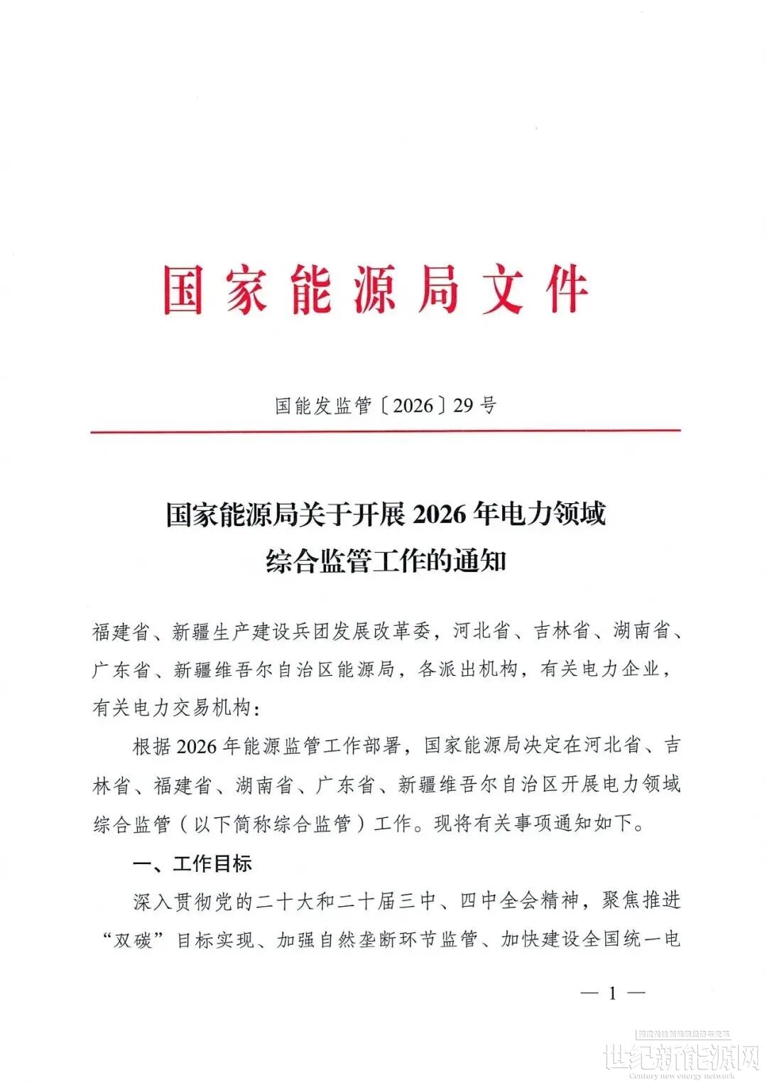 近日,国家能源局发布关于开展2026年电力领域综合监管工作的通知(国能发监管〔2026〕29号),工作内容包括节能降碳任务落实、自然垄断环节规范运营、电力市场建设和市场秩序、电力基础设施运营和用电营商环境四个方面。具体将在河北省、吉林省、福建省、湖南省、广东省、新疆维吾尔自治区开展。