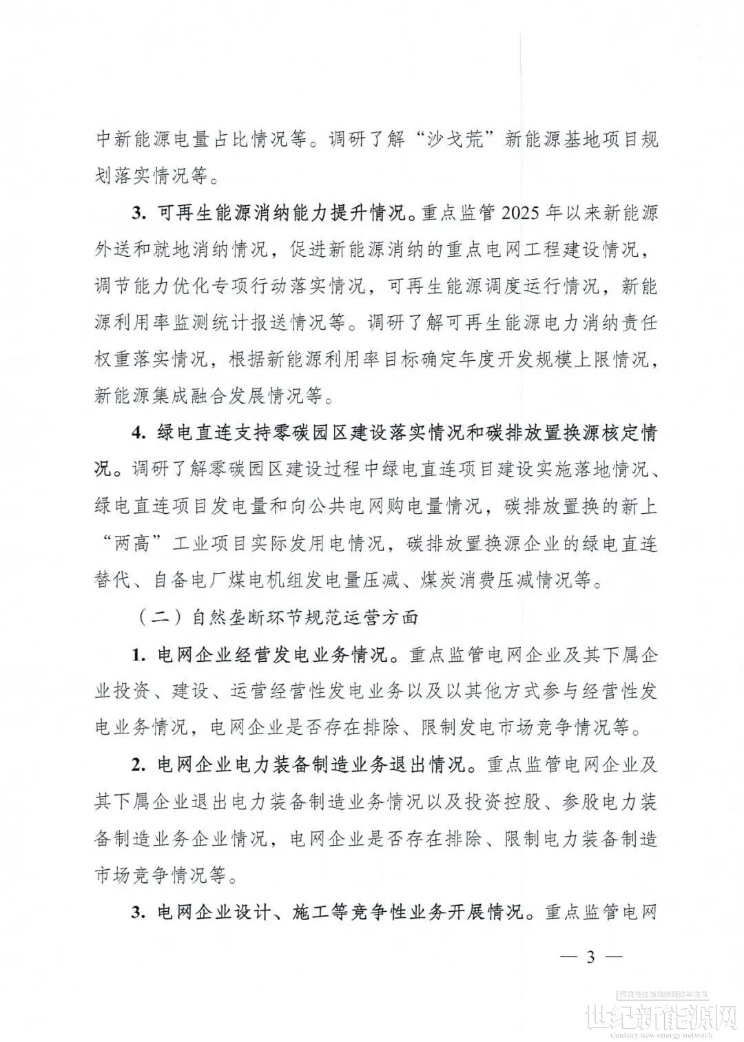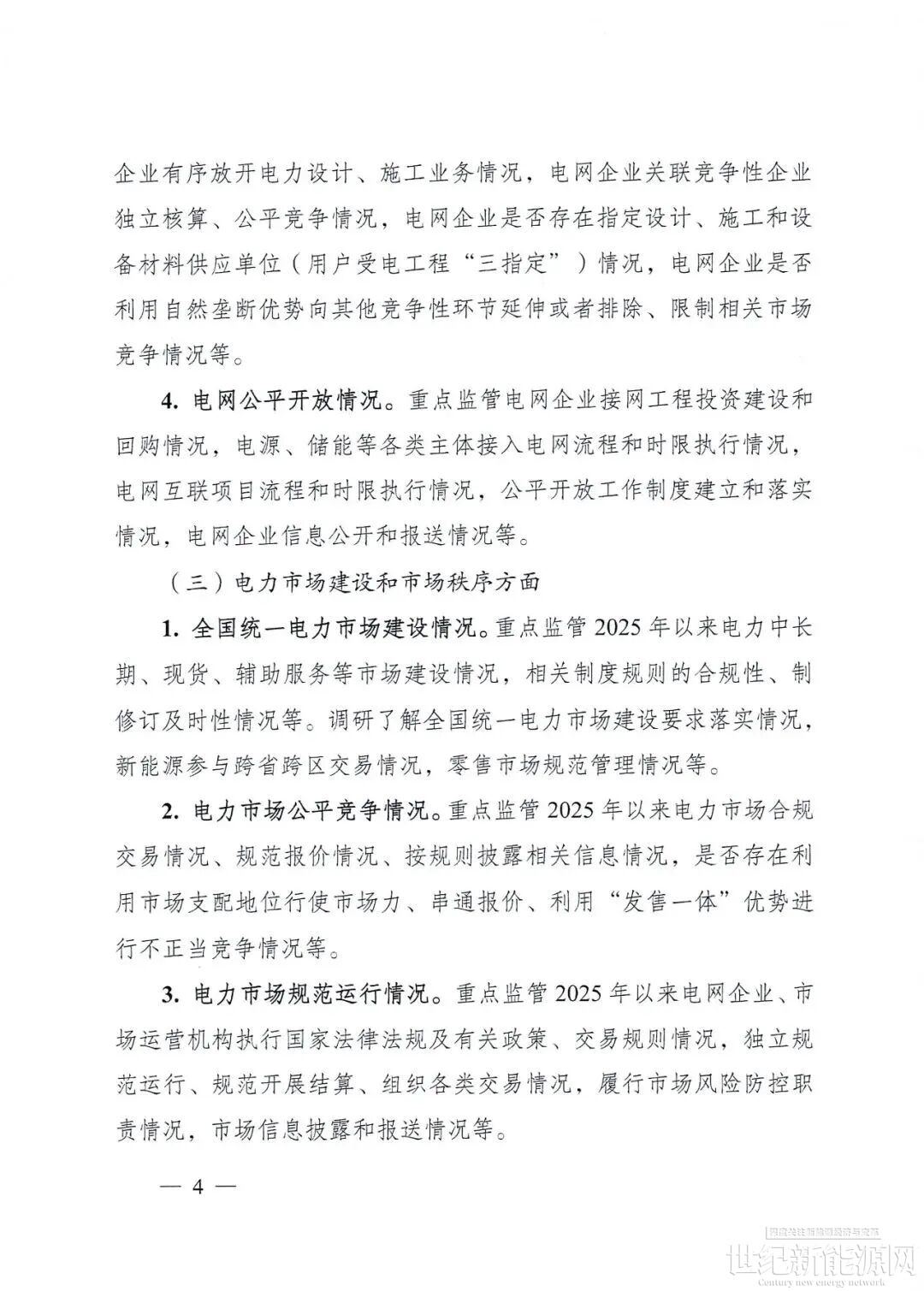 3.电力市场规范运行情况。重点监管2025年以来电网企业、市场运营机构执行国家法律法规及有关政策、交易规则情况,独立规范运行、规范开展结算、组织各类交易情况,履行市场风险防控职责情况,市场信息披露和报送情况等。