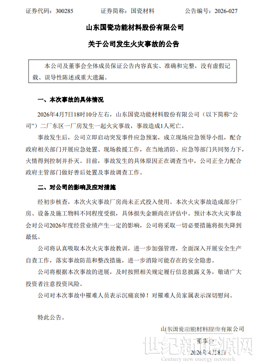 4月8日,国瓷材料发布公告称,公司一处厂房发生火灾事故,造成1人遇难。