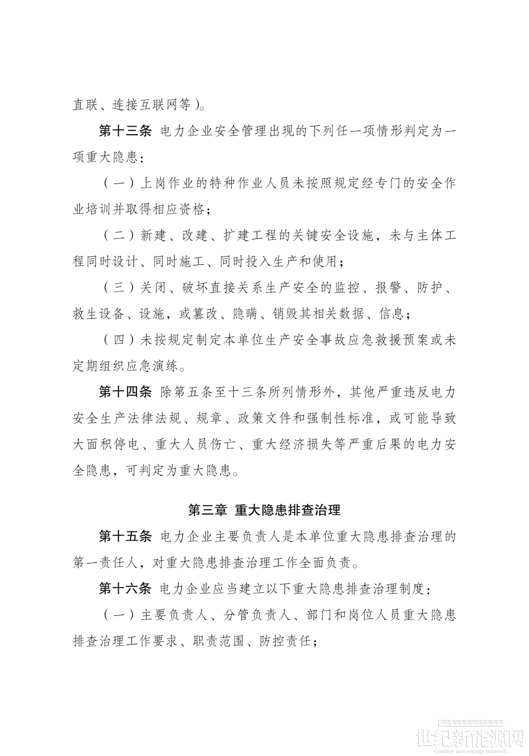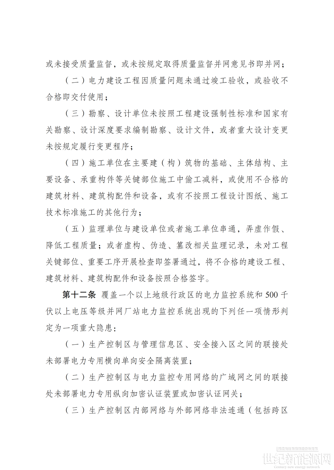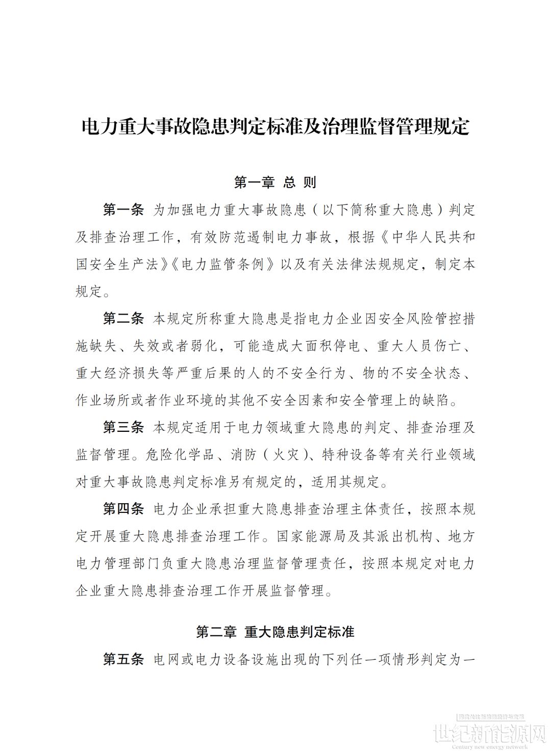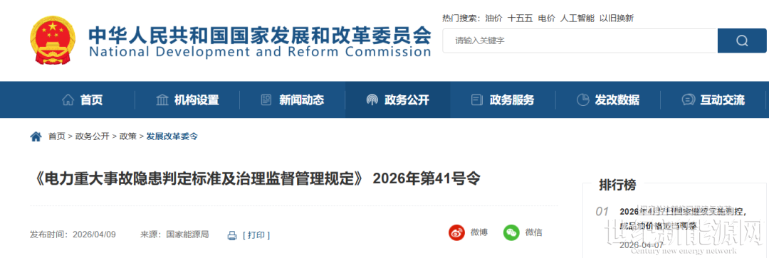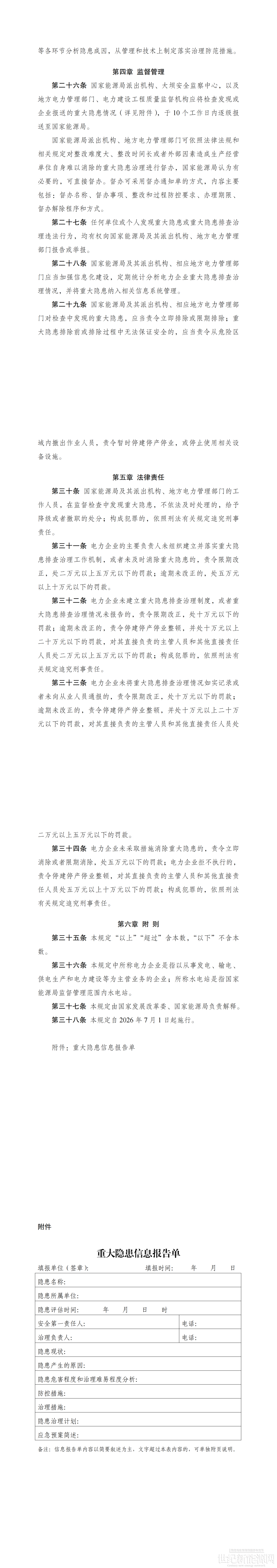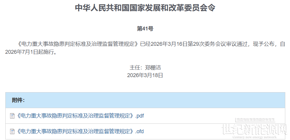 4月9日,国家发改委下发《电力重大事故隐患判定标准及治理监督管理规定》,本规定自2026年7月1日起施行。文件明确提出:电网或电力设备设施出现的下列任一项情形判定为一项重大隐患: