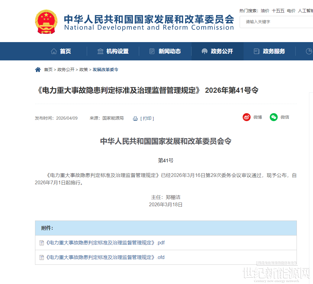 4月9日,国家发展和改革委员会发布《电力重大事故隐患判定标准及治理监督管理规定》 2026年第41号令。