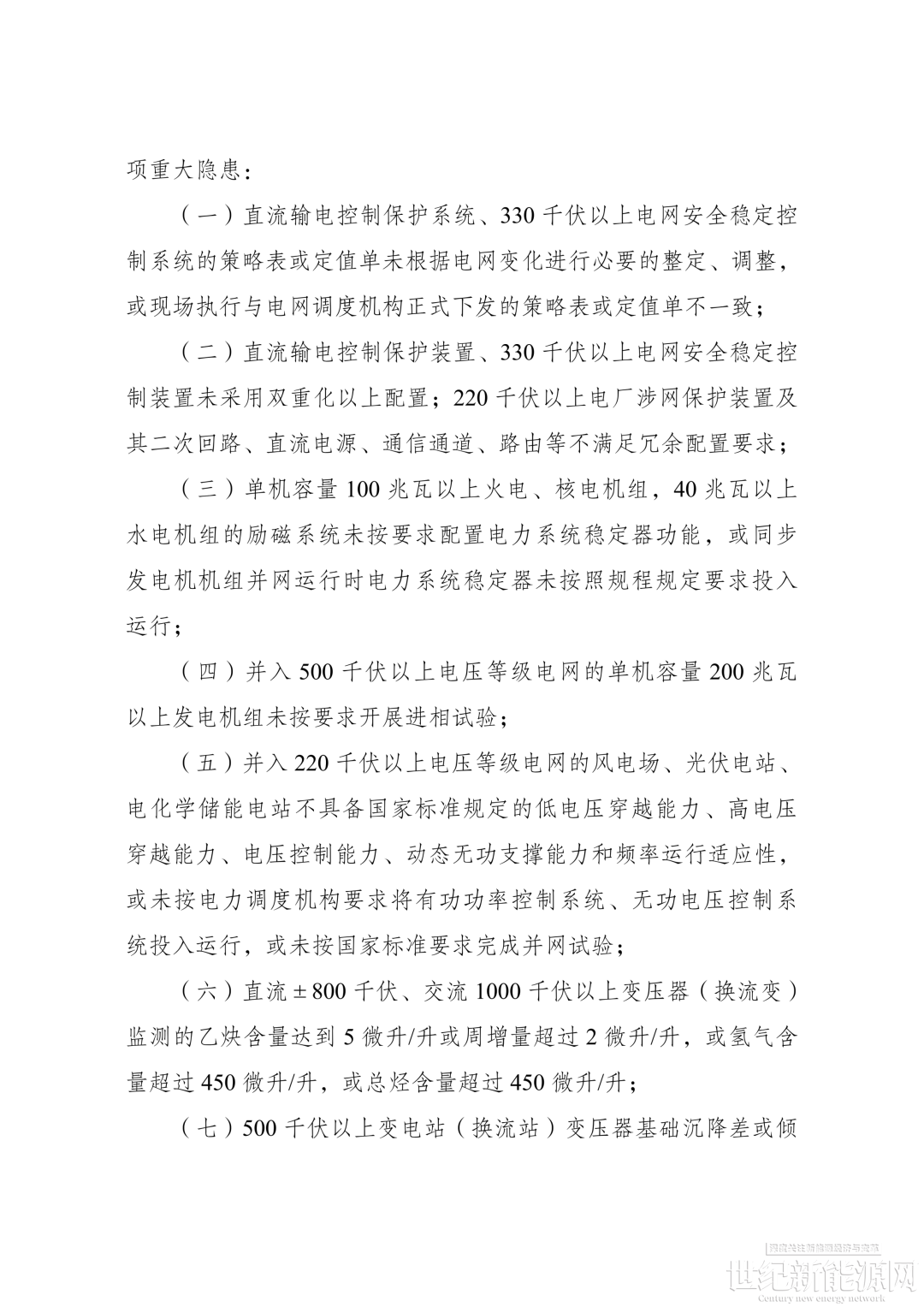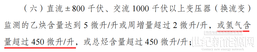 文件指出,在重大隐患判定标准中,电网或电力设备设施出现的下列任一项情形判定为一项重大隐患,其中包括:直流±800千伏、交流1000千伏以上变压器(换流变)监测的乙炔含量达到5微升/升或周增量超过2微升/升,或氢气含量超过450微升/升,或总烃含量超过450微升/升。