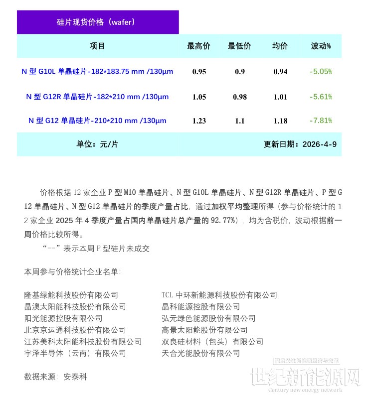 据安泰科统计,本周硅片价格承压下行。其中,N型G10L单晶硅片(182*183.75mm/130μm)成交均价在0.94元/片,环比节前下跌5.05%;N型G12R单晶硅片(182*210mm/130μm)成交均价在1.01元/片,环比节前下跌5.61%;N型G12单晶硅片(210*210 mm/130μm)成交均价在1.18元/片,环比节前下跌7.81%。据调研了解,本周下游电池片价格大幅下跌、组件价格暂无明显波动,其中电池片主流价格0.35-0.39元/W,环比节前下跌7.50%;组件主流价格0.71-0.75元/W,环比节前持平。