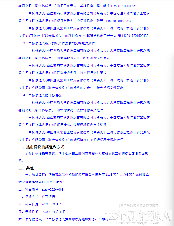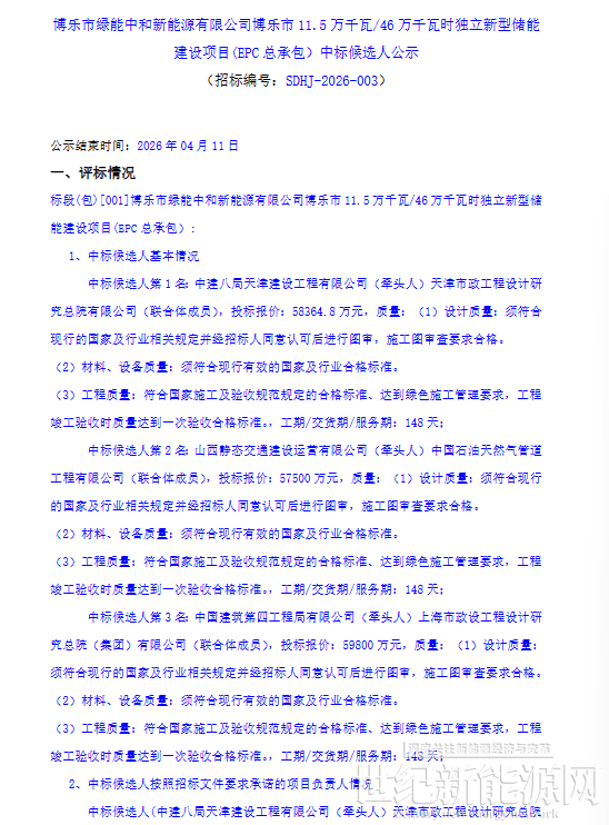 4月8日,新疆博乐市11.5万千瓦/46万千瓦时独立新型储能建设项目(EPC总承包)中标候选人公示。项目采用磷酸铁锂技术,总规模115MW/460MWh,位于博尔塔拉蒙古自治州博乐市,计划工期148天,招标人为博乐市绿能中和新能源有限公司。