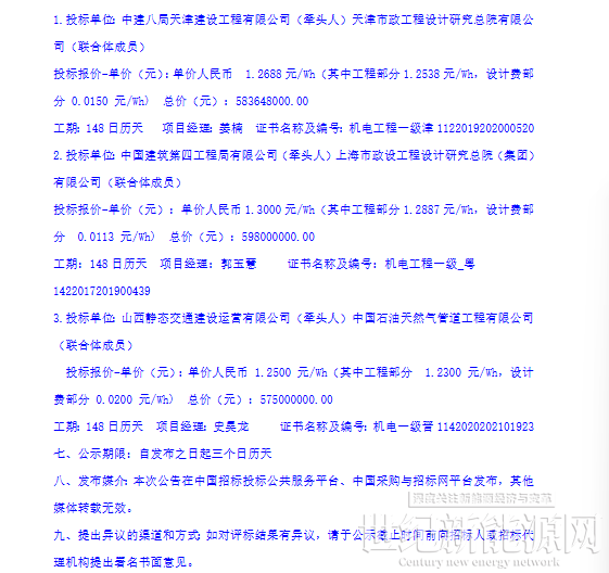 第二中标候选人:山西静态交通建设运营有限公司(牵头人)+ 中国石油天然气管道工程有限公司,投标报价57500万元,折合单价1.2500元/Wh。