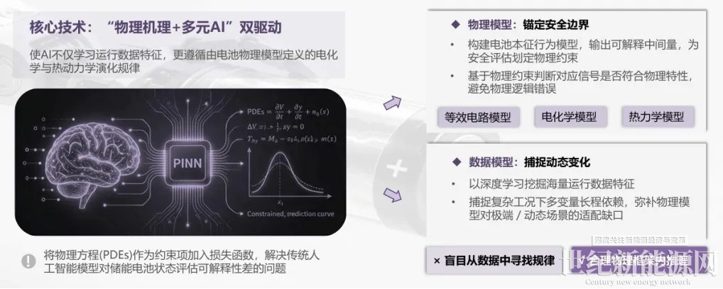 3)物理机理与多元AI双驱动数值分析内核:摒弃单纯AI“黑箱”模型,采用物理机理与数据模型双驱动技术路线。其核心是采用物理信息神经网络等先进算法,将等效电路、电化学、热力学等物理模型作为约束项嵌入AI损失函数,使AI推理既遵循物理规律,又能捕捉动态变化,实现可信的物理推理。