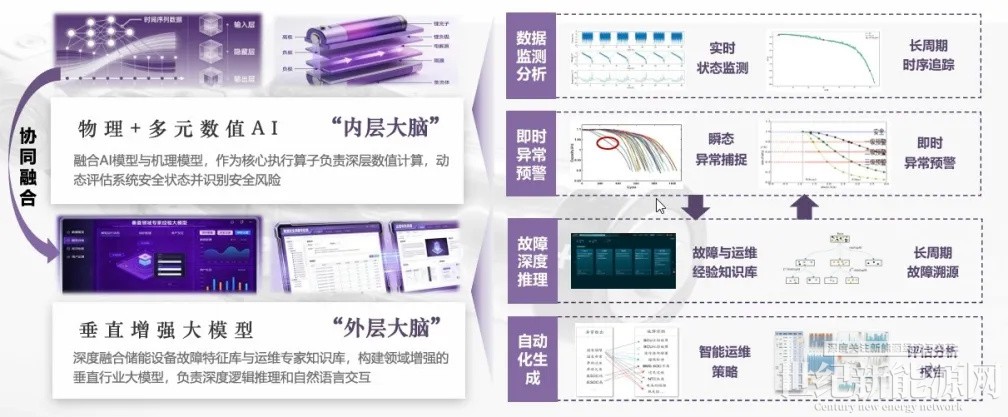梁惠施认为,当前以大数据、大模型为代表的人工智能技术,为破解上述难题提供了全新思路。人工智能凭借其非线性特征提取能力,可深度挖掘时序关联,捕捉传统监测手段难以识别的电池早期复杂多维参数模式异常,实现“早预警”;同时,通过“数据驱动+物理机理”双驱动,可弥补纯机理模型在现场动态复杂工况与高噪声下的拟合局限,实现故障的“早诊断”;此外,通过深度融合垂直领域增强大模型和智能体架构,可基于诊断结果智能生成运维策略,落实故障“早处置”。将人工智能引入储能安全防控领域,能够将储能安全系统从一个“死板的报警器”,进化成一个“会思考的专家大脑”。