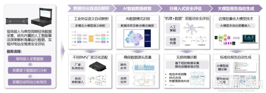 移动便携式安全检测装置:西清能源针对定期安全评估的需求,研发了非侵入式移动检测设备。该装置以前期全国5.8GWh在运场站的离线数据定期评价为技术基础,只需短时接入现场数据,即可利用内置AI算法与大模型,在不停机情况下完成全维度安全评估并自动生成报告,该装置采用“数据不出站”的本地化处理方式,支持多厂家BMS的零配置接入,通过内置的轻量化高算力AI引擎进行全维度的安全评估,并生成标准化的评估报告,将安全督导从“人治”推向“数治”。