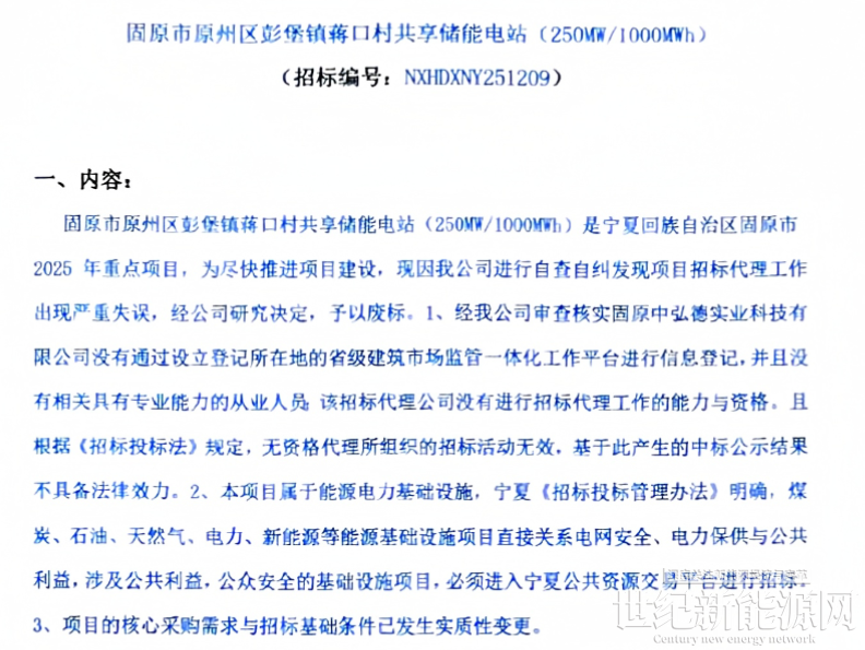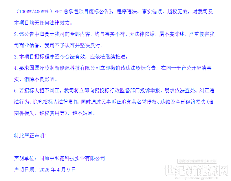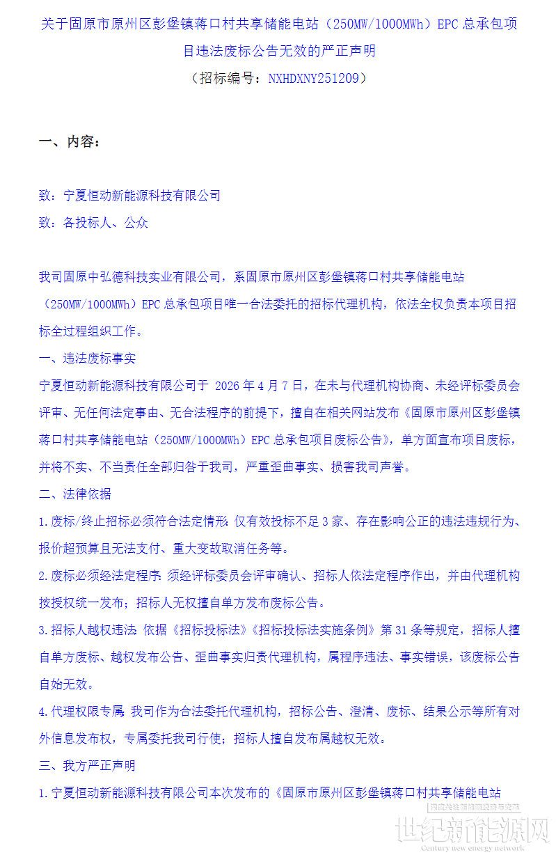 4月9日,招标代理公司固原中弘德科技实业有限公司就宁夏350MW/1.4GWh储能EPC废标公告作出声明: