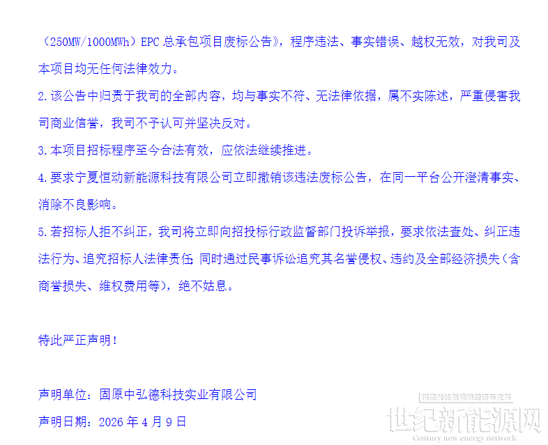 对此,招标代理公司中弘德科技认为两家公司发布的“废标公告”程序违法、事实错误、越权无效,并且公告中归责于其公司的全部内容,均与事实不符、无法律依据,属不实陈述,公司不予认可并坚决反对。并明确,本项目招标程序至今合法有效,应依法继续推进,要求宁夏恒动新能源科技有限公司立即撤销该违法废标公告,在同一平台公开澄清事实、消除不良影响。