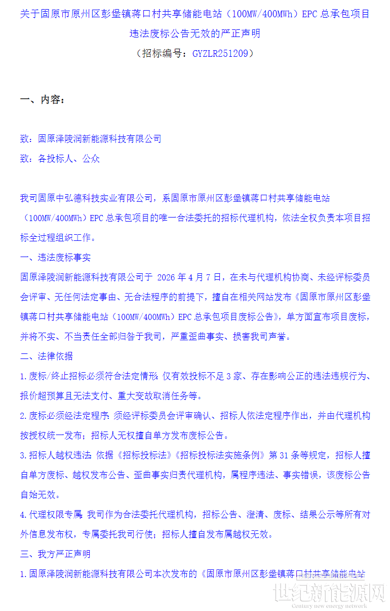 宁夏恒动新能源科技有限公司、固原泽陵润新能源科技有限公司于2026年4月7日,在未与代理机构协商、未经评标委员会评审、无任何法定事由、无合法程序的前提下,擅自在相关网站发布《固原市原州区彭堡镇蒋口村共享储能电站(250MW/1000Mh)EPC总承包项目废标公告》《固原市原州区彭堡镇蒋口村共享储能电站(100MW/400MWh)EPC总承包项目废标公告》,单方面宣布项目废标,并将不实、不当责任全部归咎于我司,严重歪曲事实、损害我司声誉。