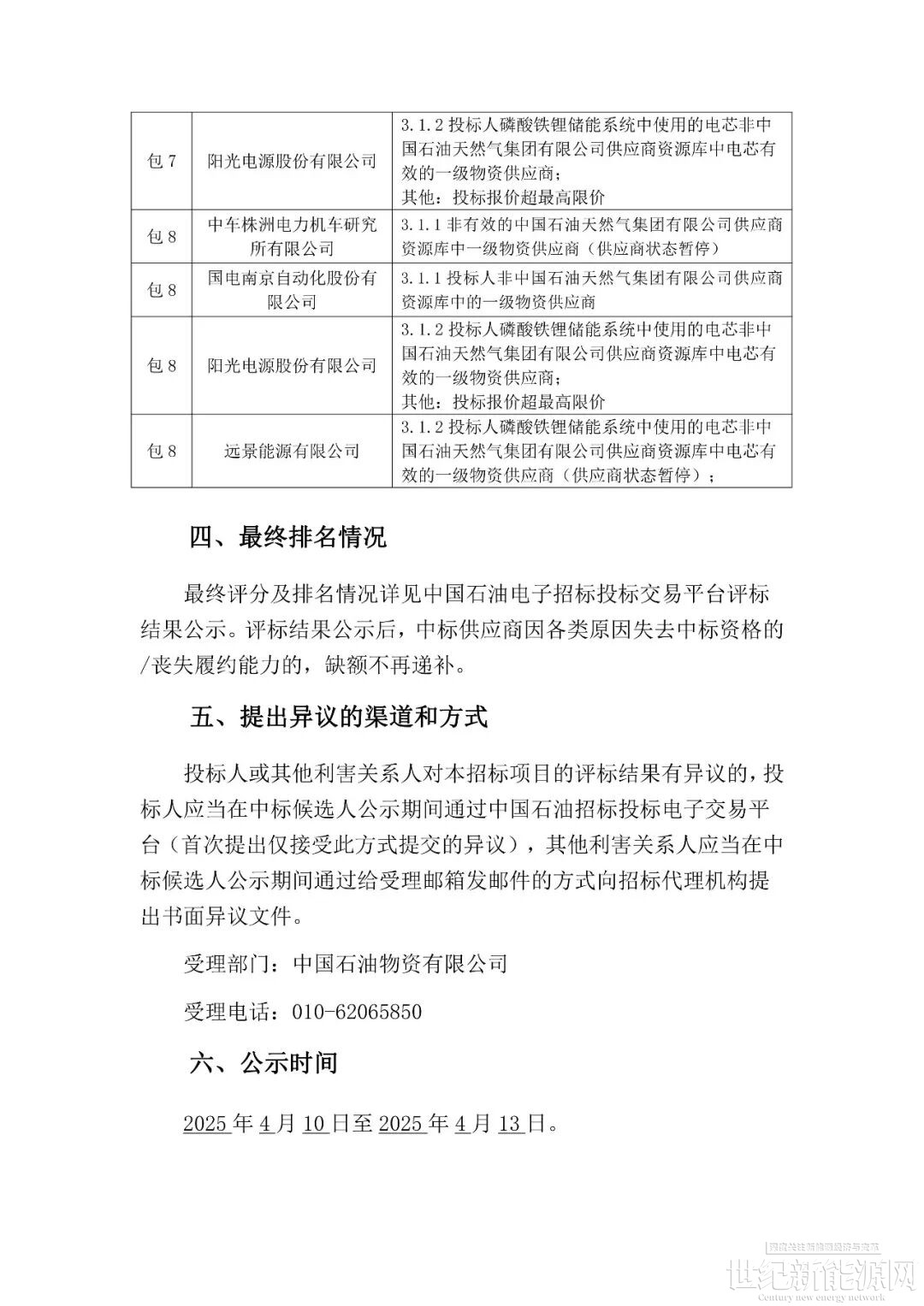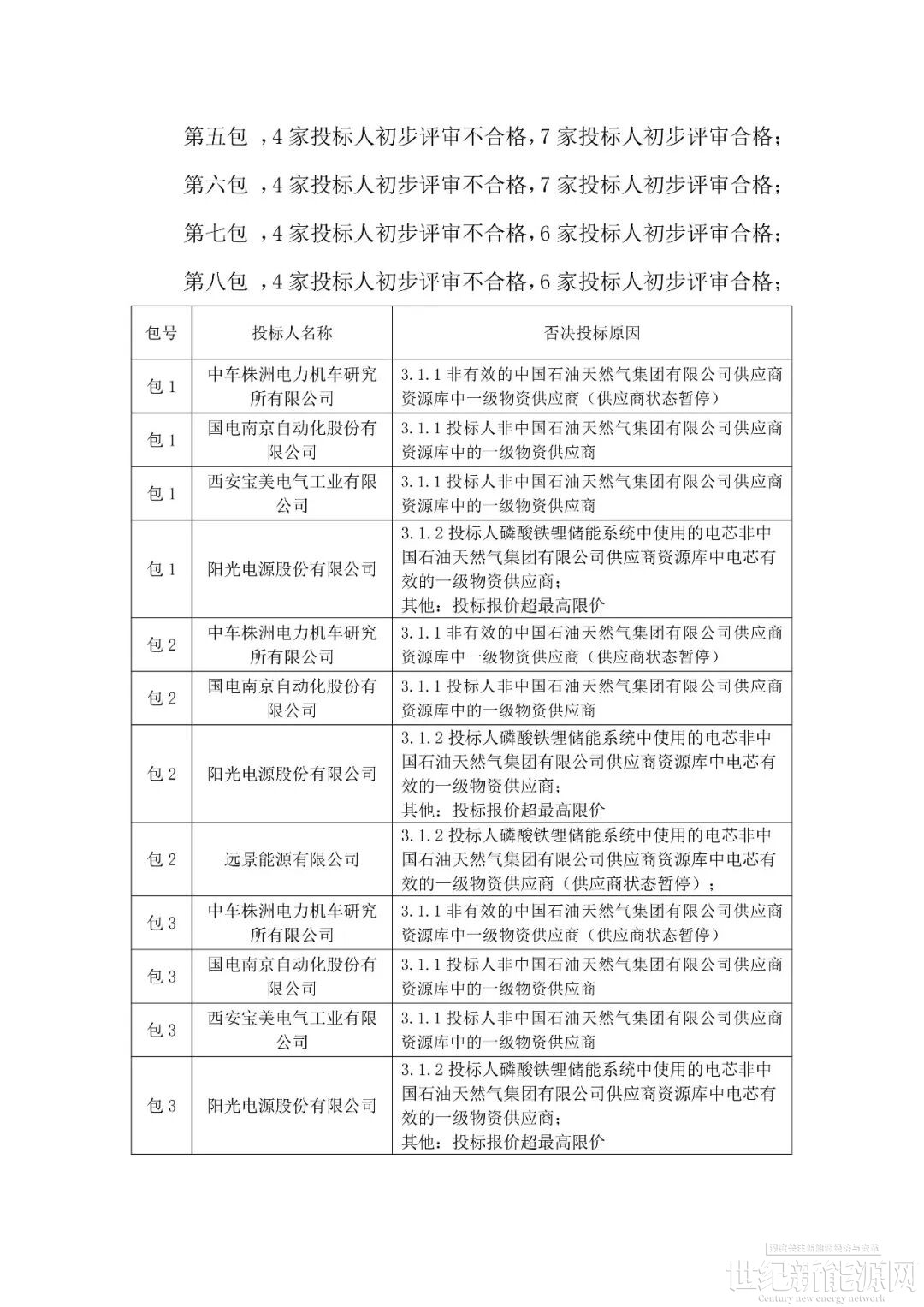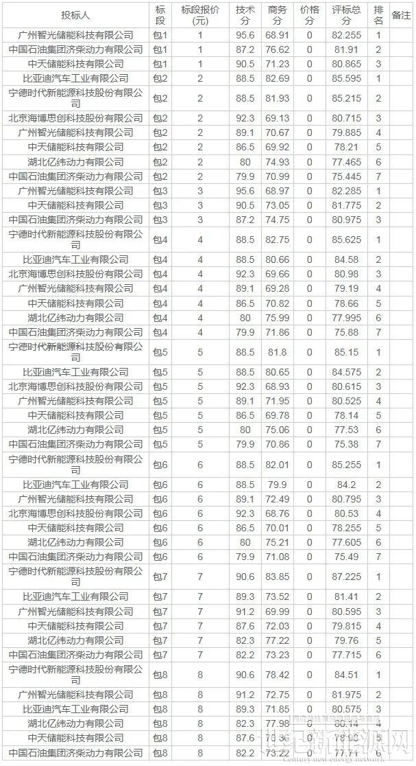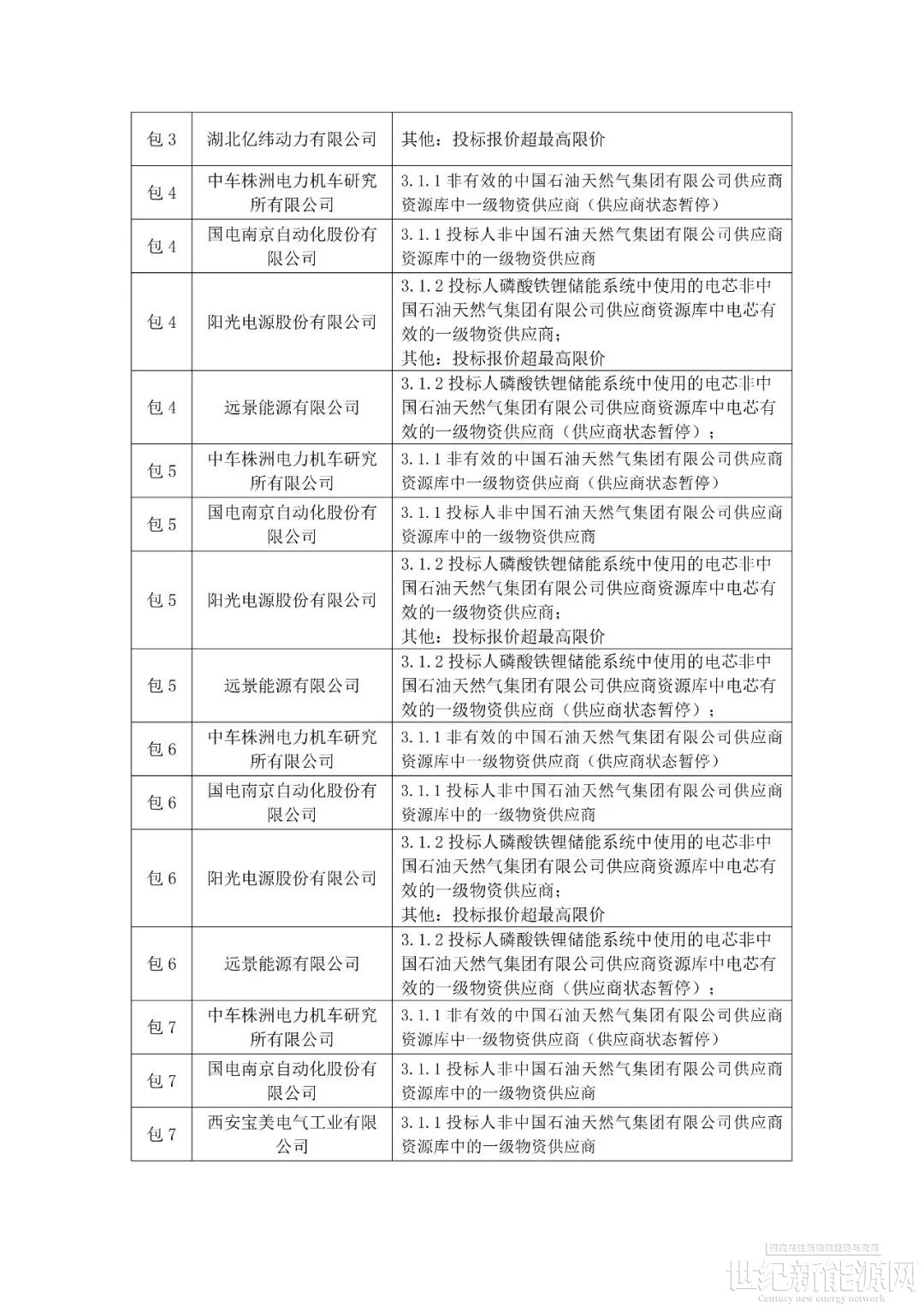 4月10日,中国石油储能系统集采中标候选人公示,此批采购含8个标包分布在6个油田12个项目区域,共采购772.5MWh跟网型储能系统,覆盖0.33C、0.5C规格。最终,中天储能、中国石油济柴动力、智光储能、宁德时代、亿纬动力、比亚迪、海博思创共七家入围中标候选人。其中广州智光储能科技有限公司、中国石油集团济柴动力有限公司、中天储能科技有限公司入围8个标包;比亚迪汽车工业有限公司、湖北亿纬动力有限公司、宁德时代新能源科技股份有限公司入围6个标包;北京海博思创科技股份有限公司入围4个标包。另外公告显示,本次招标采购中,购买招标文件的潜在投标人共32家,实际投标12家。但经过对12家投标人的投标文件初评,发现6家投标人初步评审不合格,被否决投标。