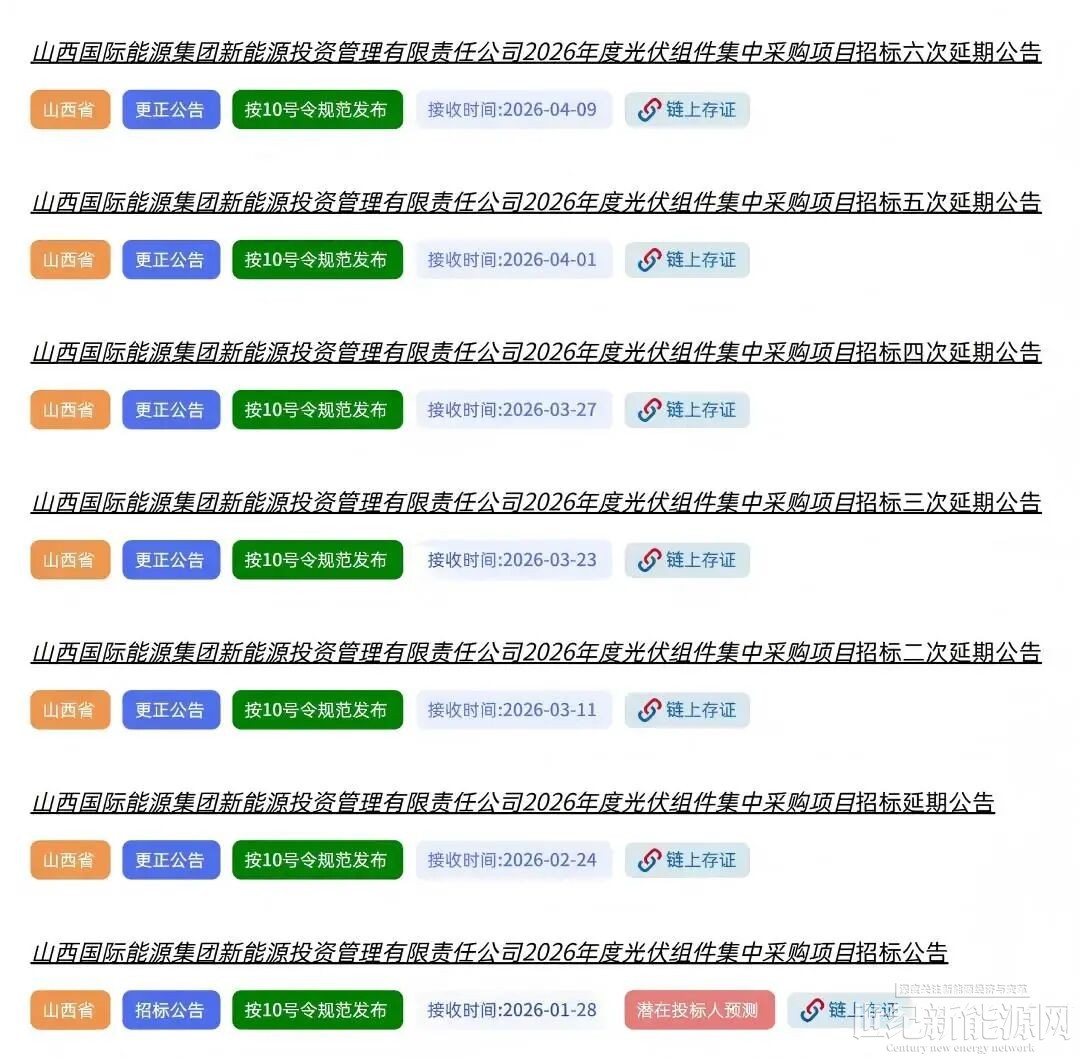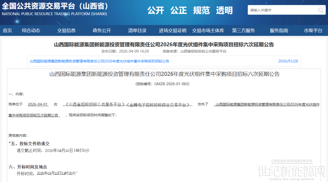 4月9日,山西国际能源集团新能源投资管理有限责任公司2026年度光伏组件集中采购项目发布第六次延期公告,将投标文件递交截止时间及开标时间由2026年4月10日延期至4月16日。